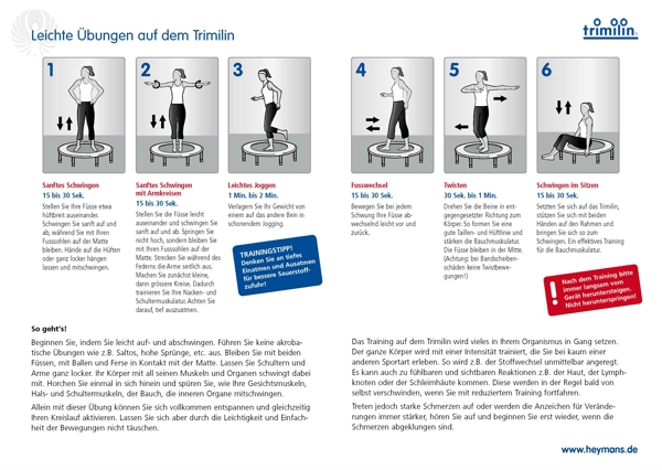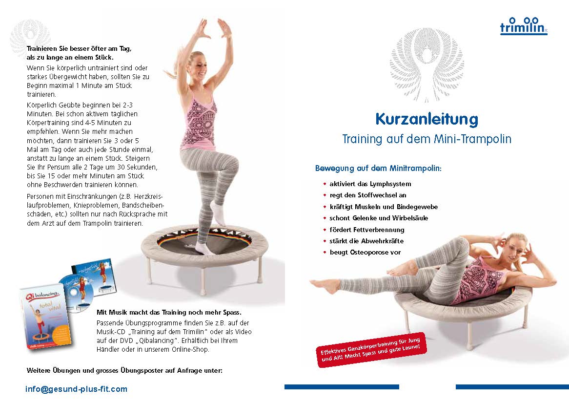 Auf dem Trimilin-Minitrampolin wird Ihr ganzer Körper von Kopf bis Fuß in harmonische, gelenkschonende Schwingung versetzt. Dabei wird jede Zelle Ihres Körpers trainiert und gestärkt. Dies hilft dem Organismus, Verspannungen aufzulösen und zu seinem energetischen Gleichgewicht zurückzufinden. Die körpereigene Regulationsfähigkeit wird aktiviert.