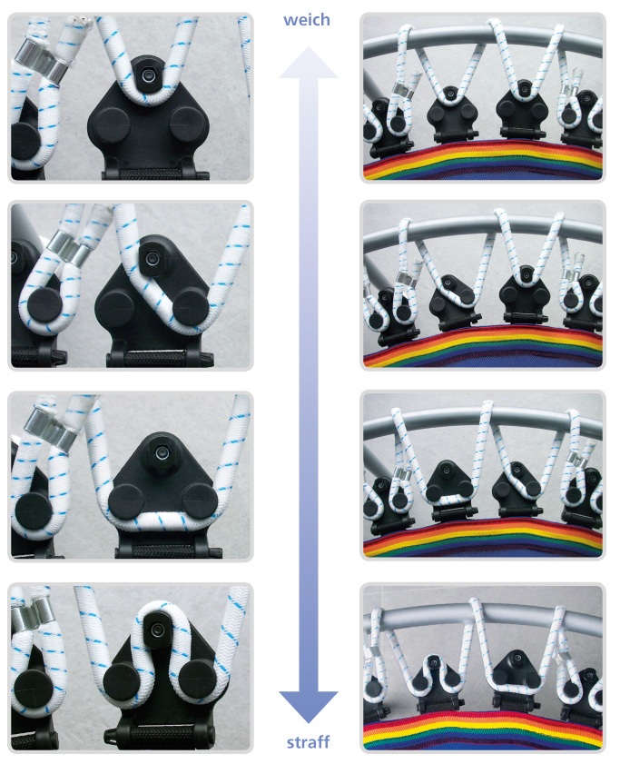 Kein Austausch von Kabel oder einzelnen Gummiringen nötig! Auch wenn z.B. Personen mit unterschiedlichem Körpergewicht das Trampolin benutzen möchten. Die Grundeinstellung des Weichheitsgrades bei Auslieferung entspricht dem des Trimilin-miniswing.